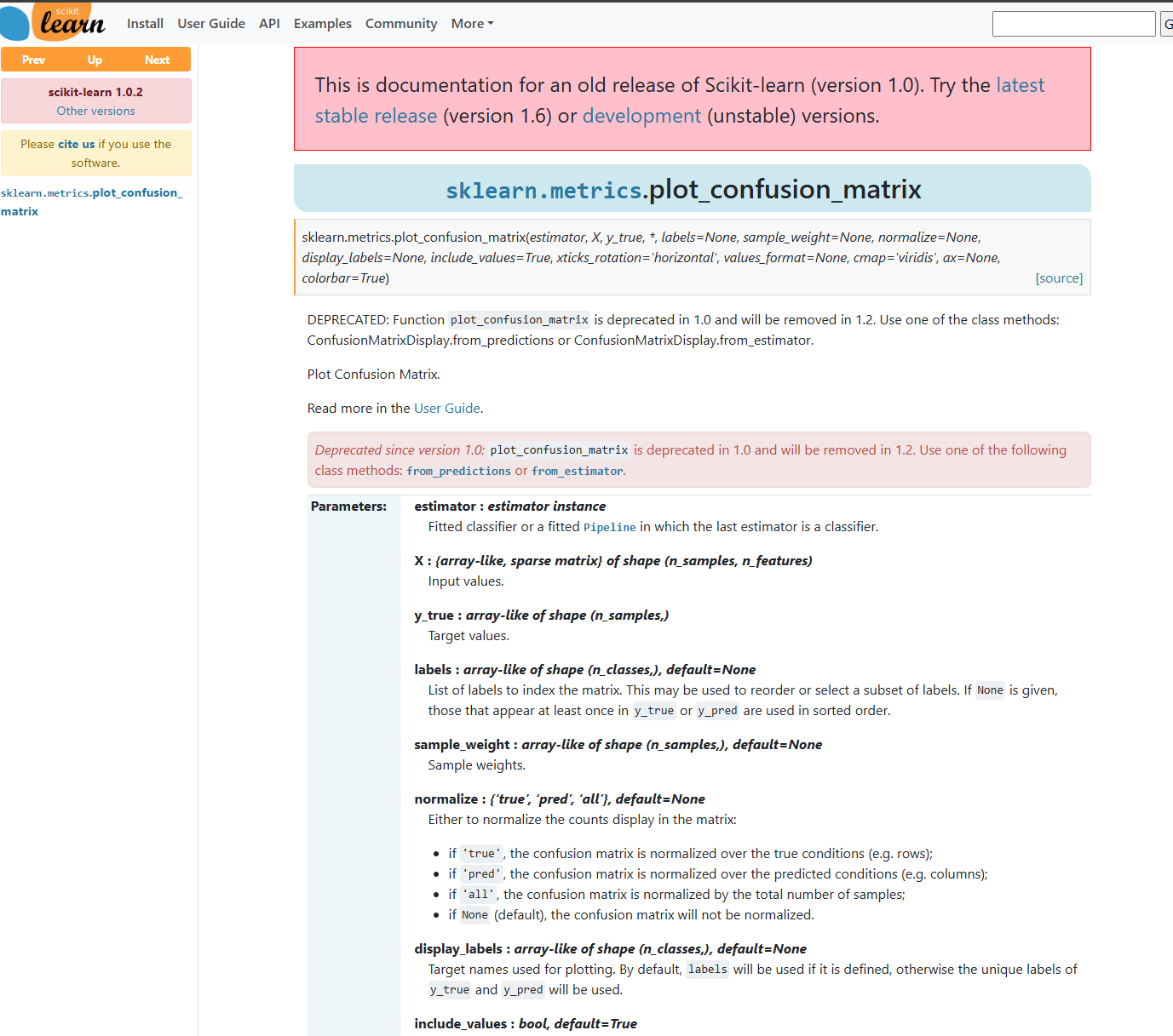 Scikit-learn 홈페이지에서 확인해보시면 plot_confusion_matrix 함수는 1.0.x 버전에서 사용되던 함수임을 알 수 있습니다.
